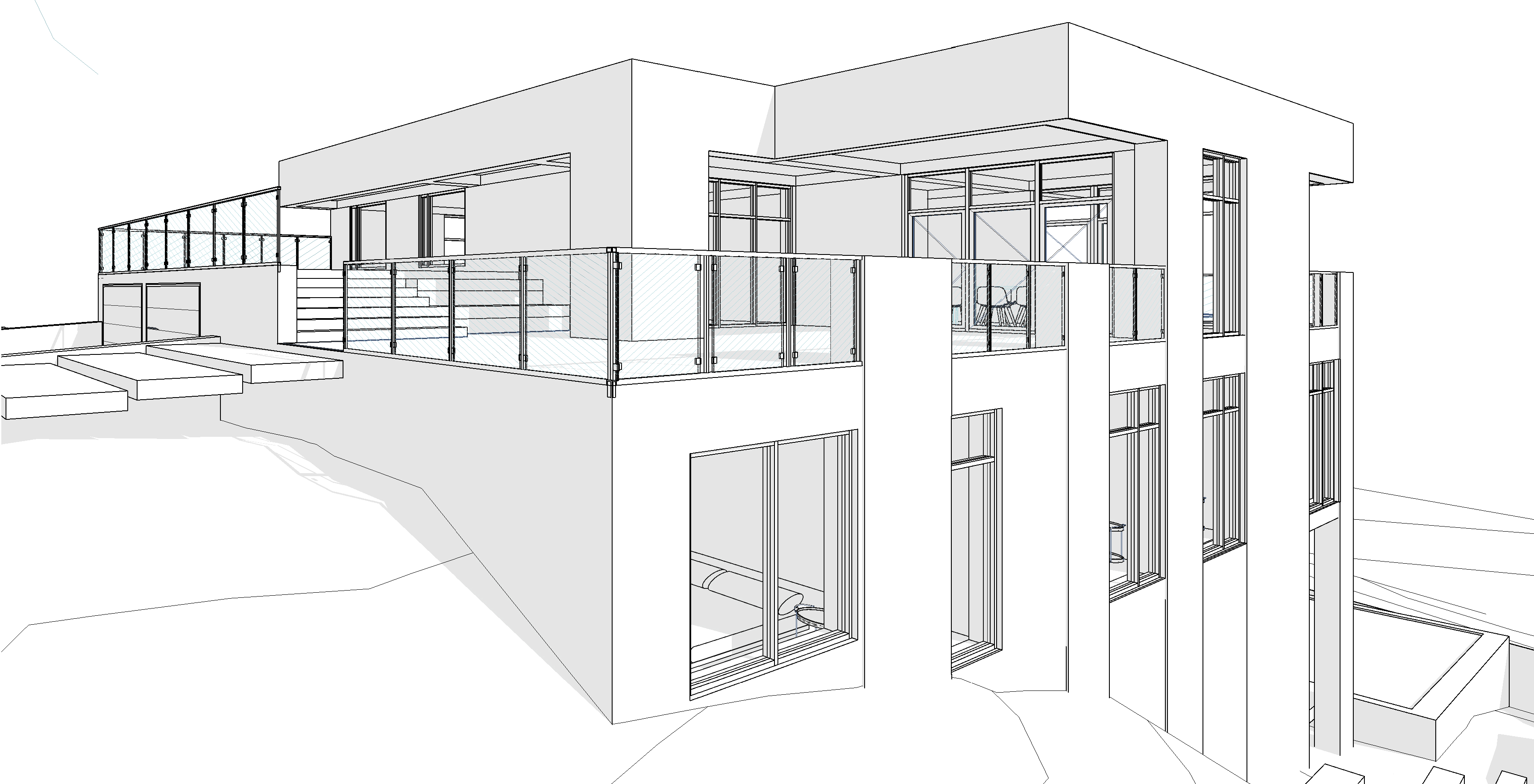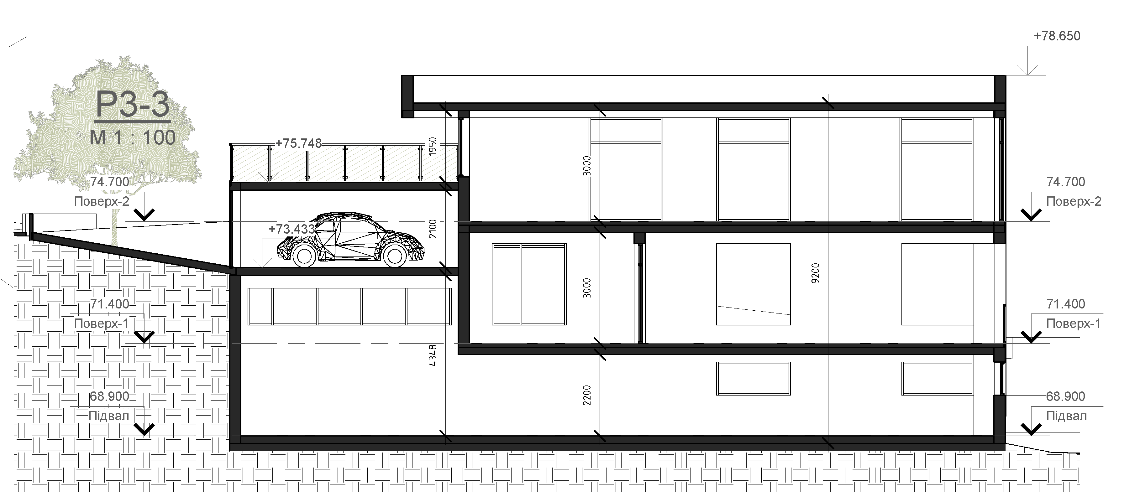 Просторова структура сформована через роботу з перепадами висот, які використані для логічного функціонального зонування та організації різних рівнів проживання. Такий підхід дозволив створити чітку, зрозумілу композицію без зайвої складності.