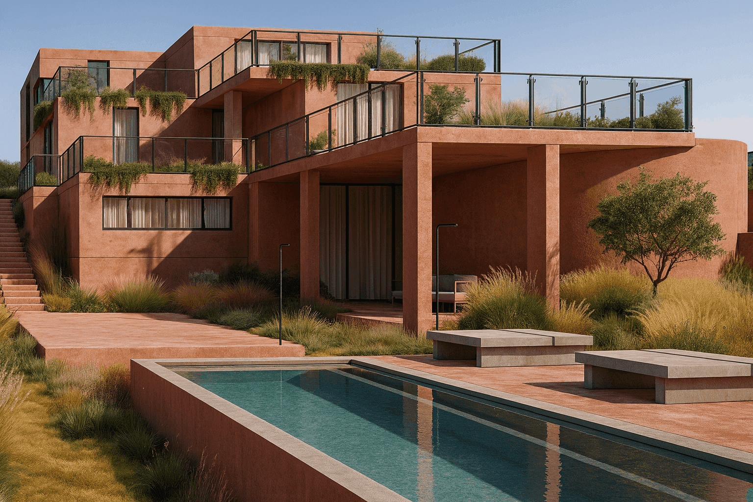Теракотовий фасад відсилає до локального контексту та традиційної матеріальності регіону, забезпечуючи природну інтеграцію будівлі в ландшафт. Об’ємно-просторова композиція підпорядкована рельєфу й не вступає з ним у конфлікт.