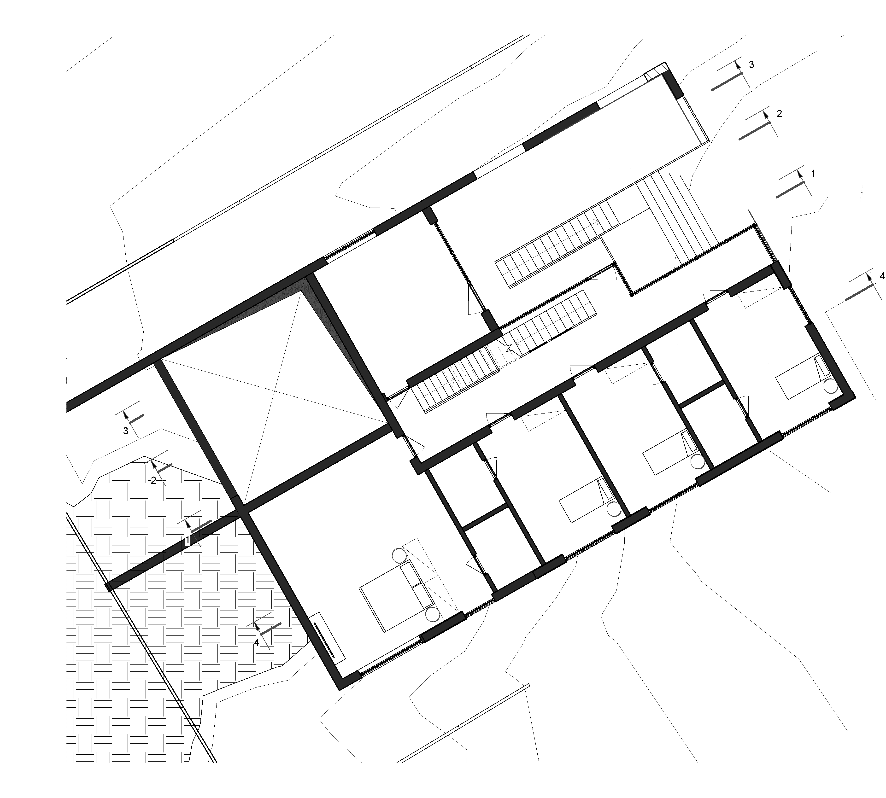 Планування чітко розділяє спільні та приватні зони, забезпечуючи комфортне життя великої родини. Перепади рельєфу дали змогу сформувати тераси та напівприватні простори для щоденного користування й відпочинку.