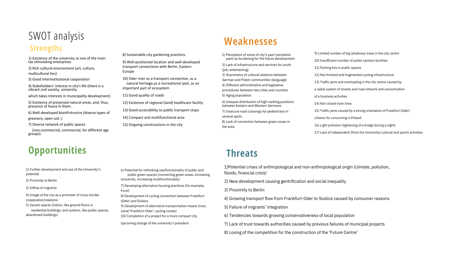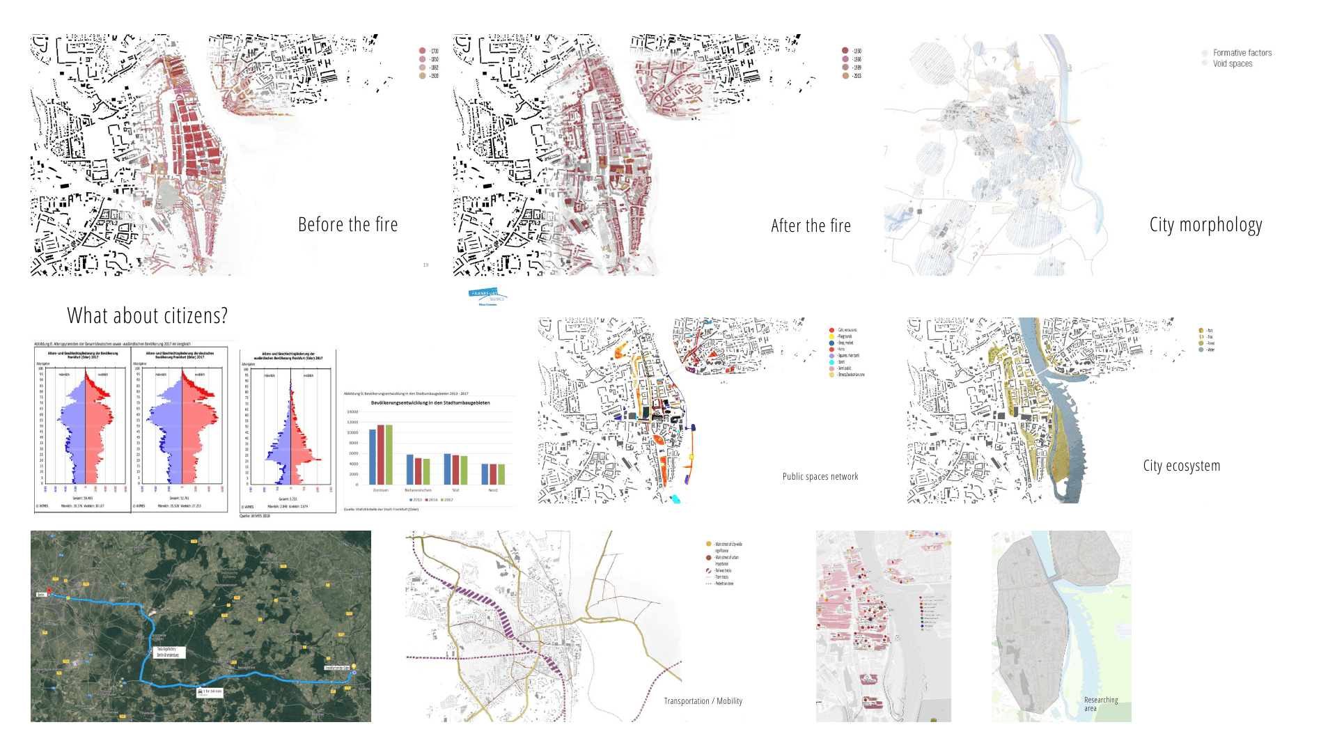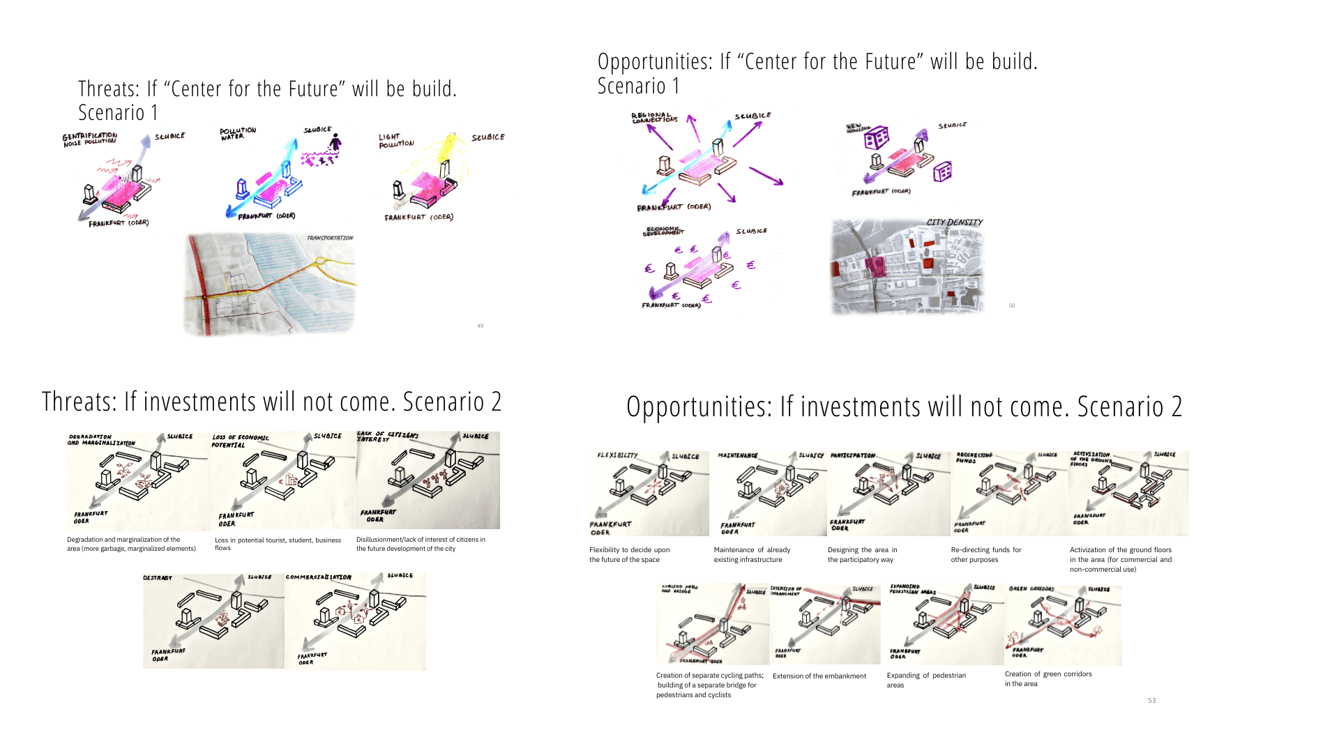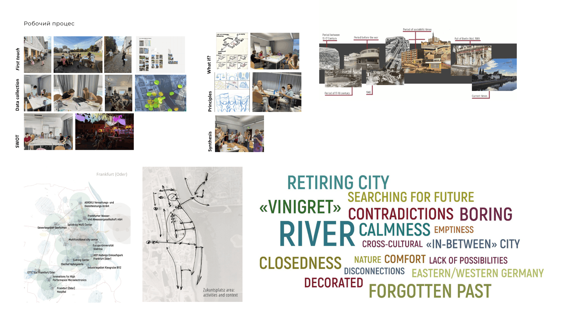 Ми досліджували різні частини Франкфурта (Одер) і Слубіце з різних точок зору: транспорт і мобільність, мешканці та види діяльності, ідентичності, міська екосистема громадських просторів. Ми провели 2 тижні, гуляючи, малюючи, креслячи, картографуючи, обговорюючи та досліджуючи в пошуках ідеї майбутнього, майбутнього Zukunftsplatz. Поки Франкфурт (Одер) прагне виграти конкурс на будівництво Центру майбутнього (Zukunftszentrum), який стане місцем для досліджень переходу, зустрічей, діалогу та культурного центру, ми спокусилися запропонувати наше бачення самої будівлі та місця. Однак, розуміючи обмеження, ми вирішили краще подумати про бачення та принципи, які можуть допомогти місцевій громаді сформувати майбутнє площі та території навколо неї, оскільки ми глибоко віримо, що остаточне рішення має залишатися за громадянами Франкфурта (Одер ).